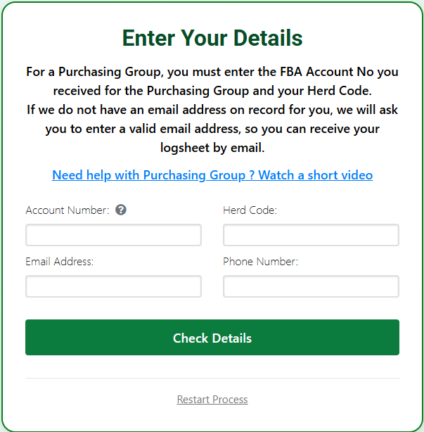 The farmer has to enter the FBA Account No they got from the Purchasing Group and they enter their Herd Code. It will also show the farmer’s email address. The system checks that the herd code is associated with the purchasing group account no and then allows the farmer to create their logsheets in the normal way. Payment is not taken here but is processed later through the Purchasing Group account.