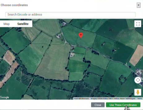 When you click on the map option it will use your current location to focus the map on this position. However, you can enter an Eircode if you wish. Once you are at the required paddock, you tap with your finger on the point in the centre of the paddock (example below is a random location).