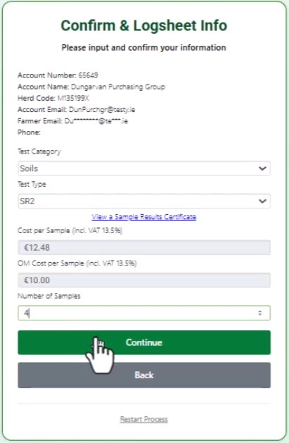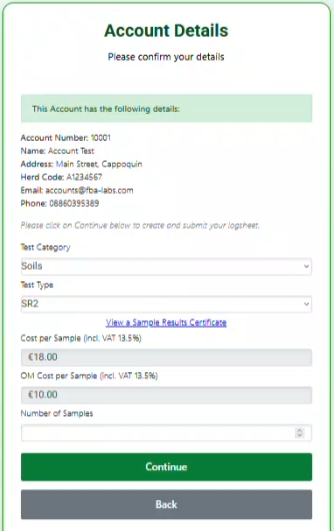 You can select any Test Category from Soils, Forage, Grass and Water, Once you make a selection, you then select the Test Type from the drop down. You must then enter the number of samples. Click on Continue to move to the next step.