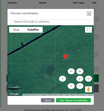 You then select the Use these Coordinates and these are updated to the sample you selected. For each sample the initial location is maintained so you do not have to go through the full process of finding your farm each time.