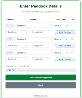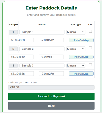 This brings you to the Sample detail entry screen. Enter the details of each of the Samples. If the test category is Soils, then you will have the option to either enter the lat/long for each sample or use the Pick On Map to capture these details – see below. You can also indicate if you require an Organic Matter (OM) test for a sample. The total cost is indicated at the bottom of the screen.