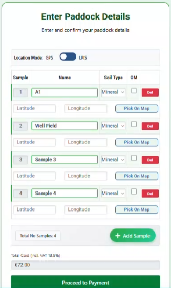 This brings you to the Sample detail entry screen. Enter the details of each of the Samples. If the test category is Soils, then you will have the option to either enter the lat/long for each sample or use the Pick On Map to capture these details – see below. You can also indicate if you require an Organic Matter (OM) test for a sample, delete or add an extra paddock. The total cost is indicated at the bottom of the screen.
