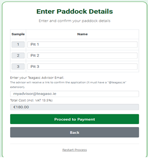 If you have chosen the option to go through a Teagasc Application, then the above screen will look a bit different as shown on the right. You must provide the email address of your Teagasc advisor.