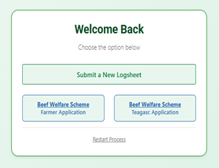 Once these details are entered you click on Continue. You are then asked to make a choice between 3 options. You can Submit a New logsheet (for Soils, Forge, Grass or Water samples that will be delivered to FBA) or you can create an Order as part of the Beef Welfare Scheme2025. There are 2 options associated with the latter, set up you own BWS application or set a BWS application up with a Teagasc advisor – see section later for Beef Welfare Scheme 2025.